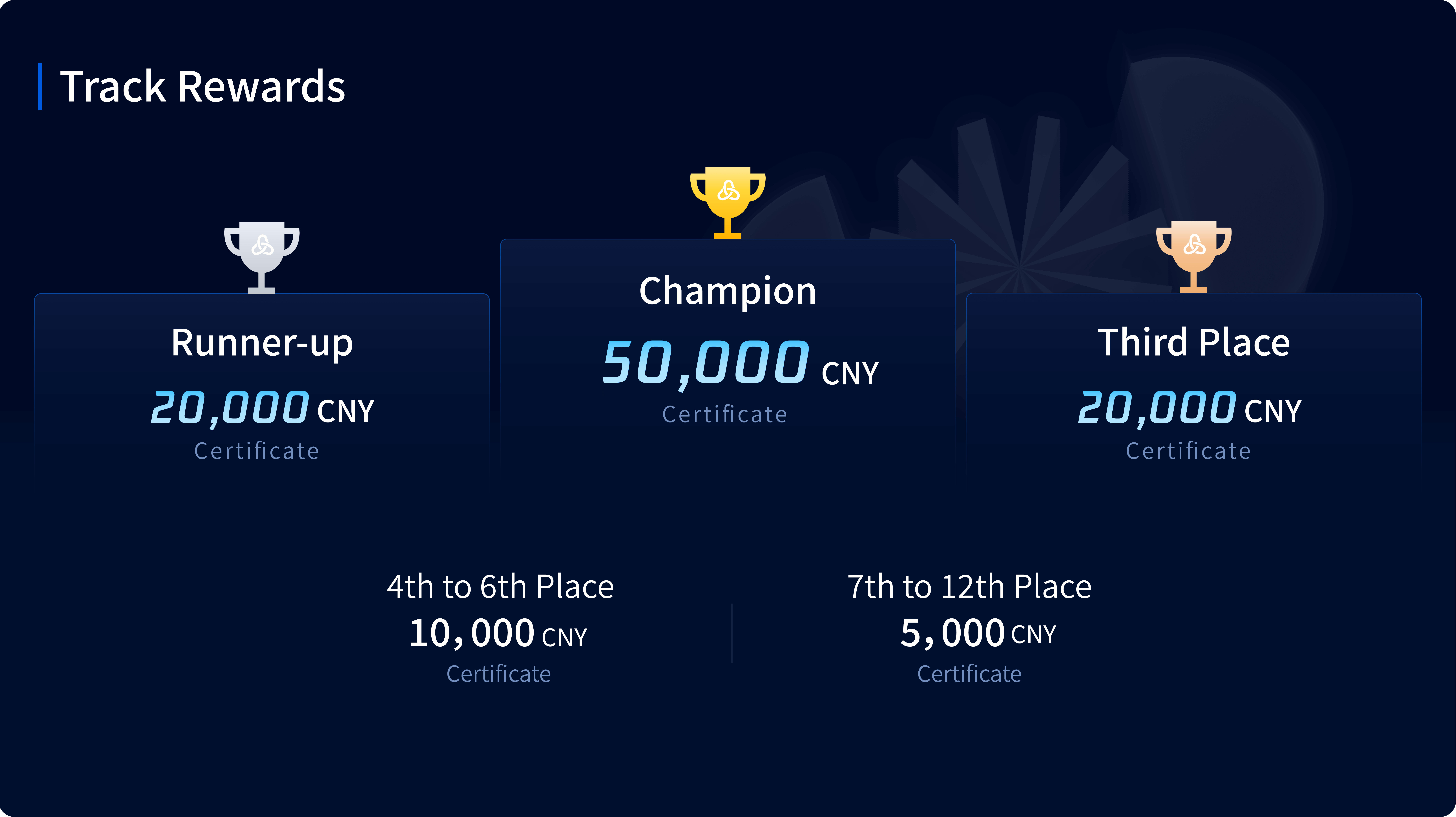 For all participating teams, the final score of this track consists of two parts: [Online Ranking] and [Offline Evaluation]. The top 12 teams in the online ranking will be required to participate in the offline defense session, and the total score will be evaluated with reference to the results of the two parts, and the first, second and third prize certificates and corresponding prizes will be awarded in order. The amount of prize money is RMB (before tax).